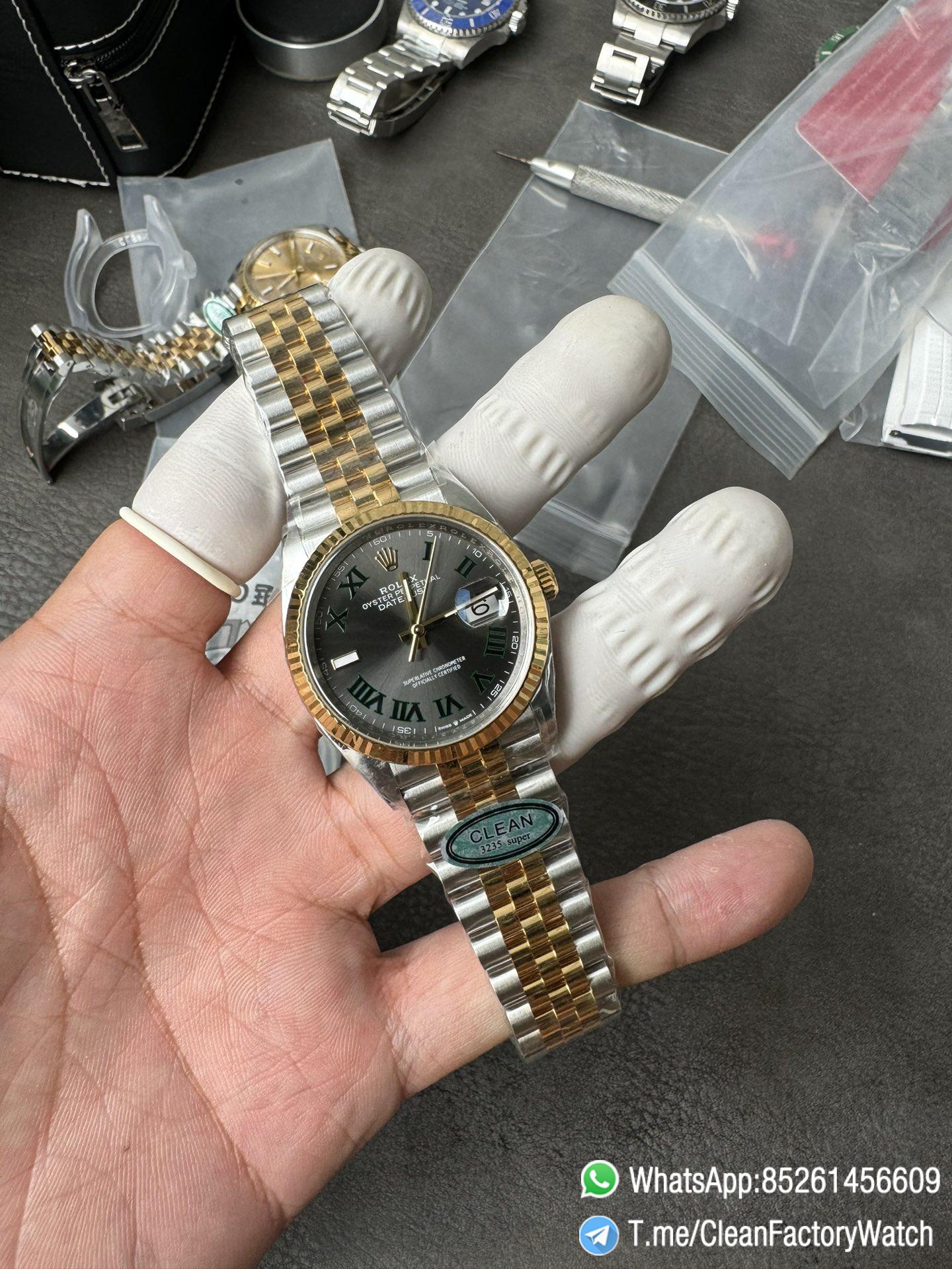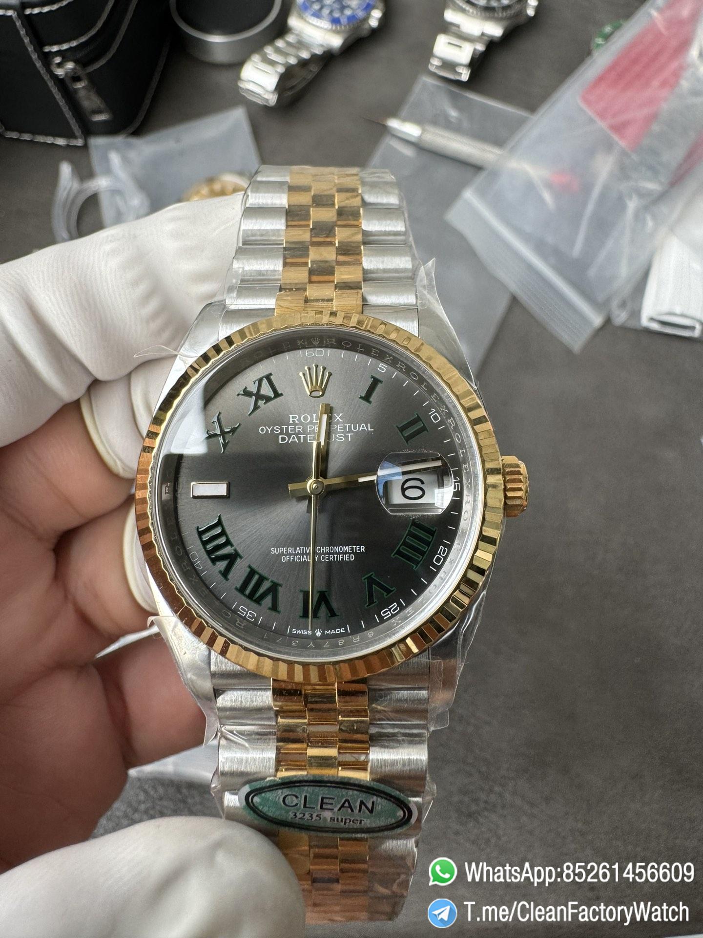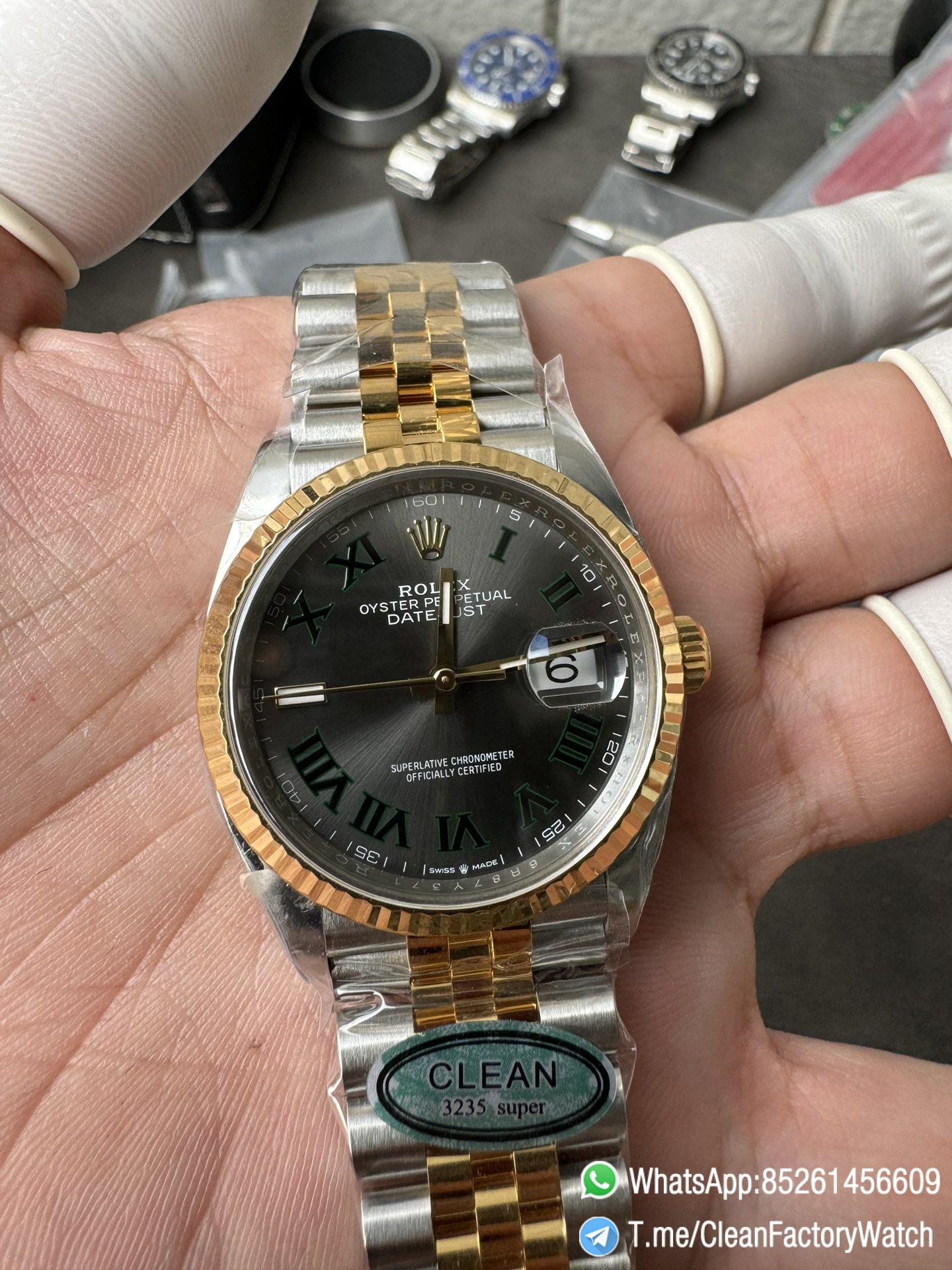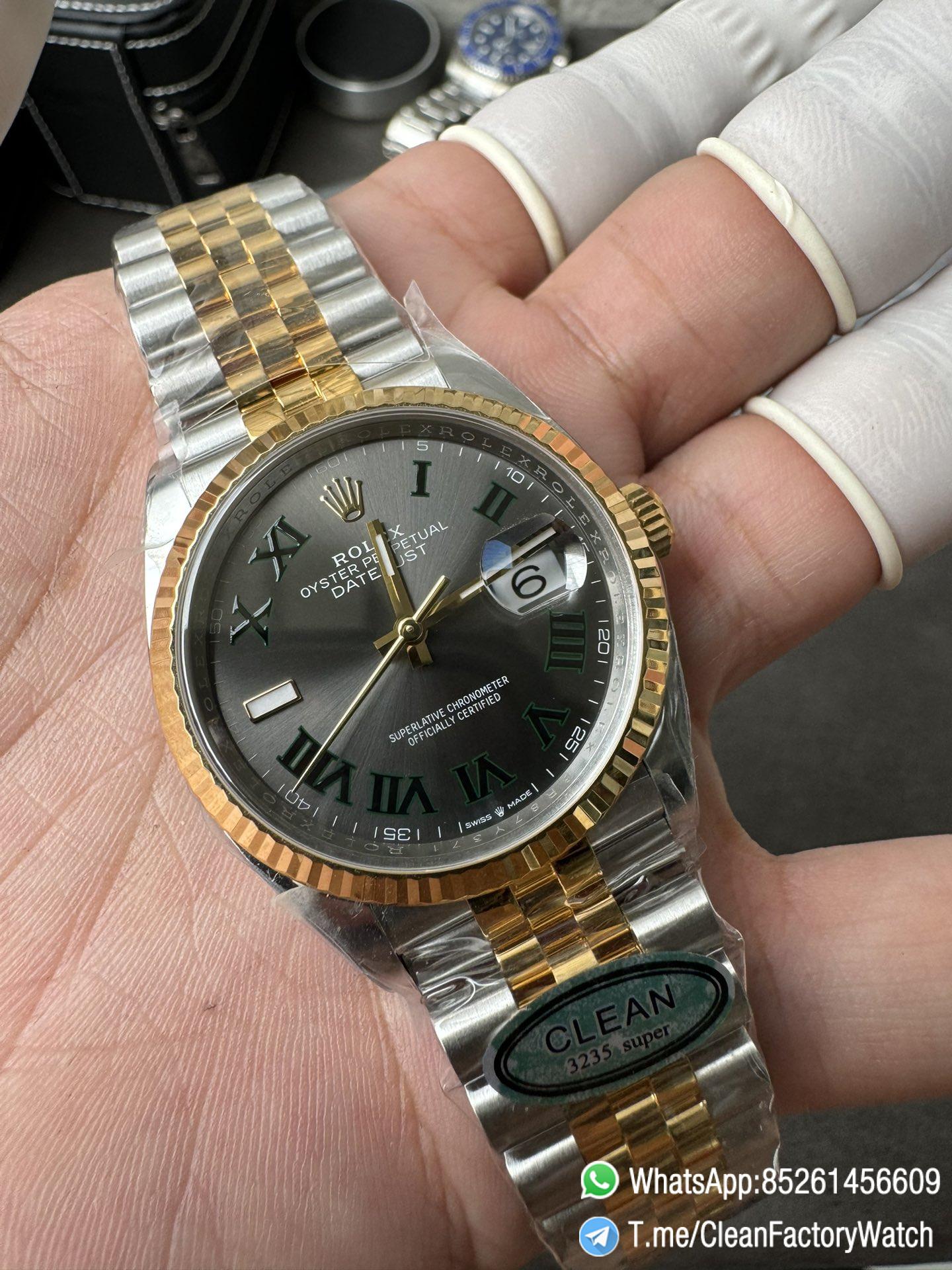 ● Dial: Grey dial with green Roma number markers;