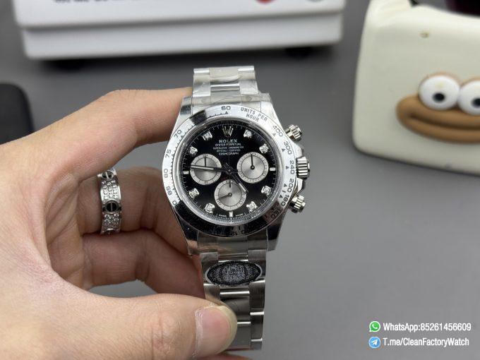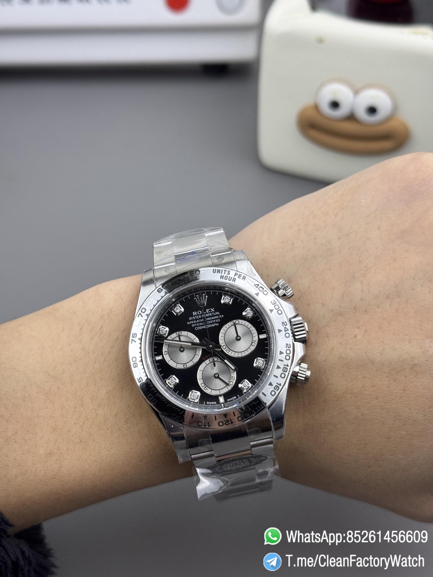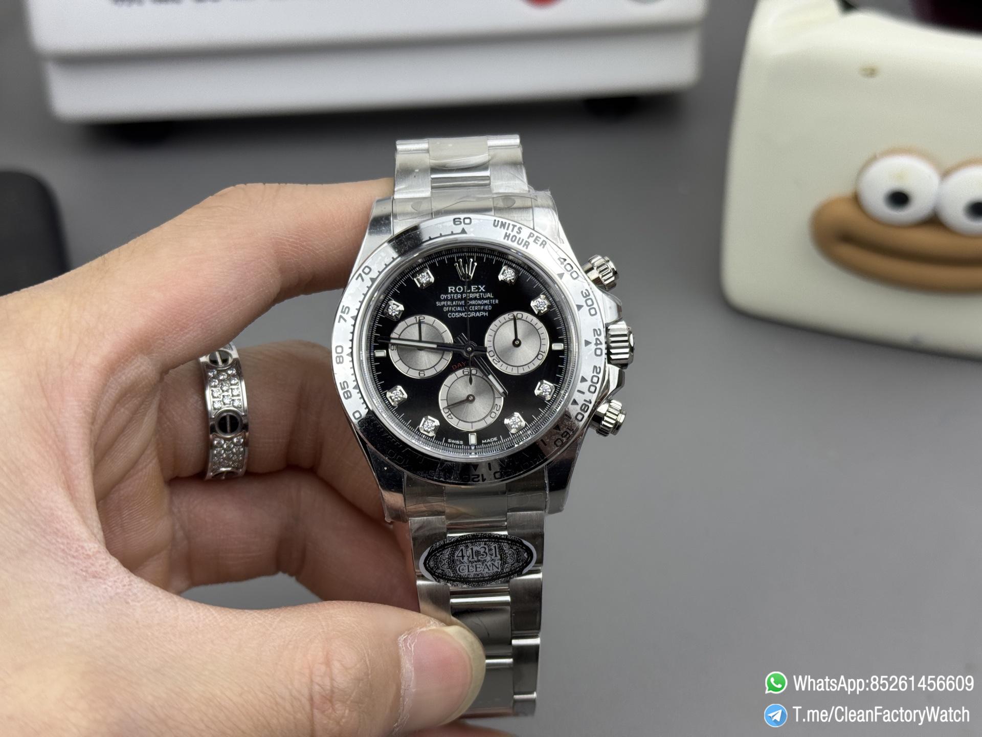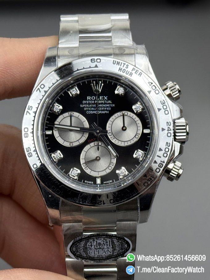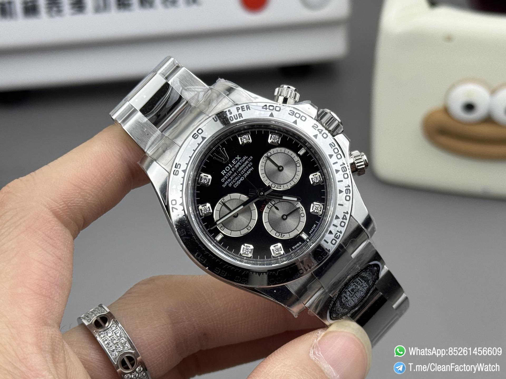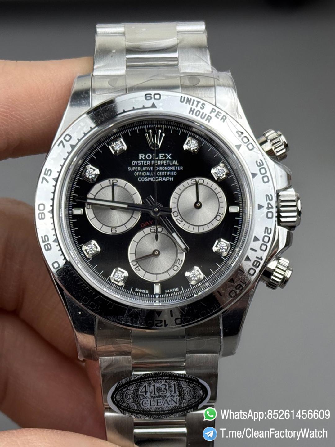 ● Dial: Black dial with silver chrono sub-dial and diamonds hour markers;